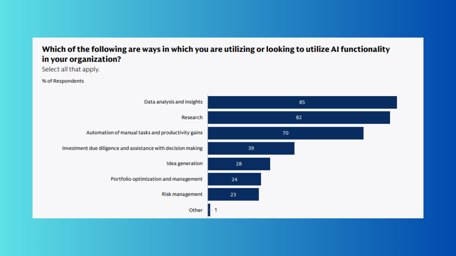 The use of AI is widespread amongst Family Offices but generally for limited tasks such as data analysis, providing insights and delivering productivity gains. A much smaller number are using AI for tasks with an element of “decision making” such as risk and portfolio management.